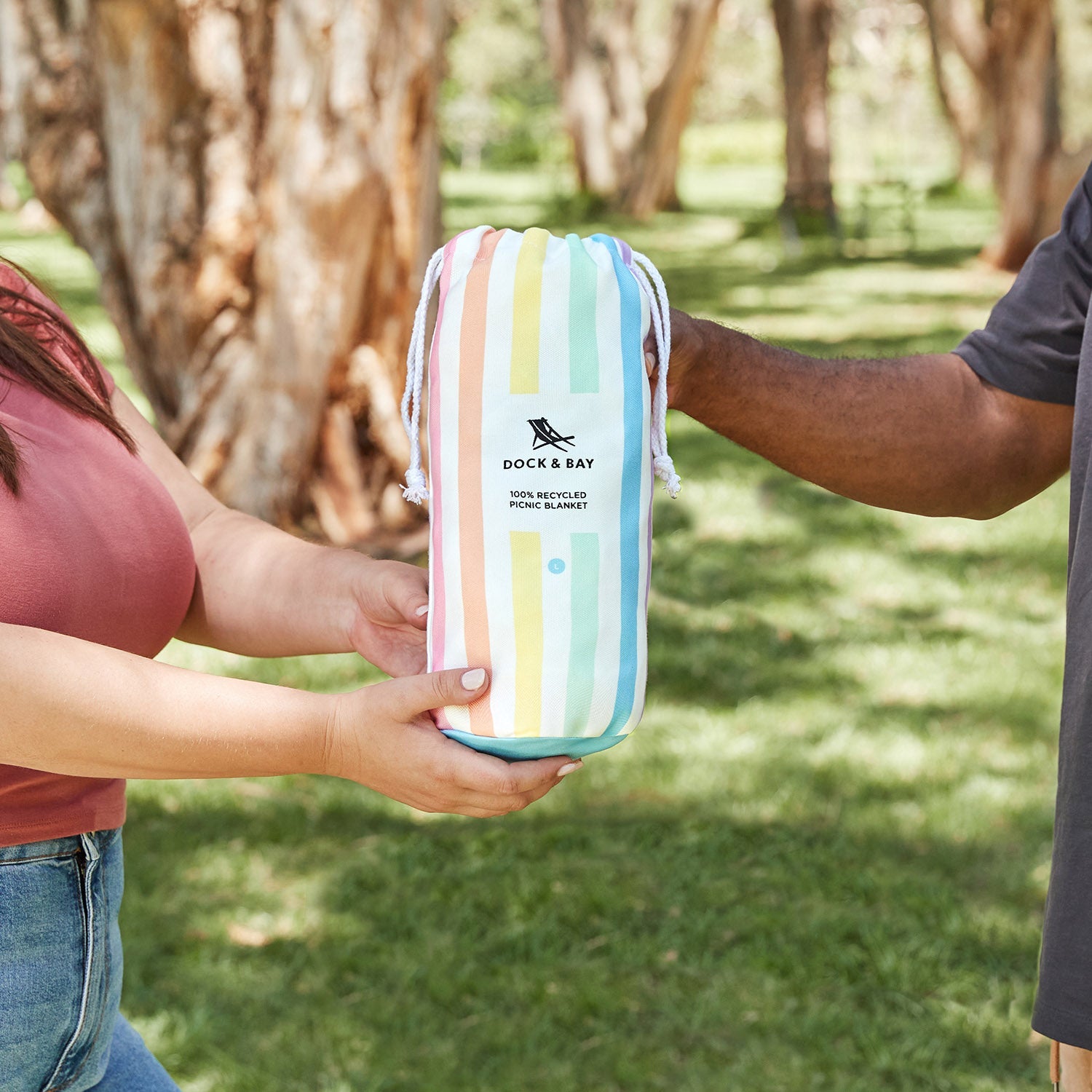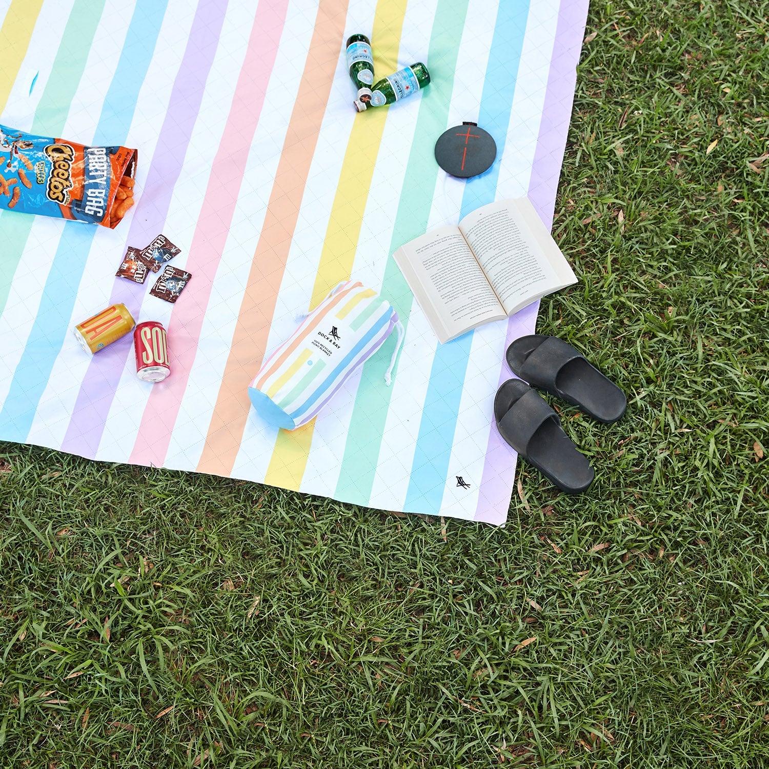 Made from 100% recycled materials and finished with a water resistant backing, it’s designed to handle grass, sand, and damp ground with ease. Soft towel material (DryQ™ fabric) on top for sitting or lounging, tough underneath for real outdoor use. When you’re done, it folds down neatly into its carry pouch, ready for the next adventure.