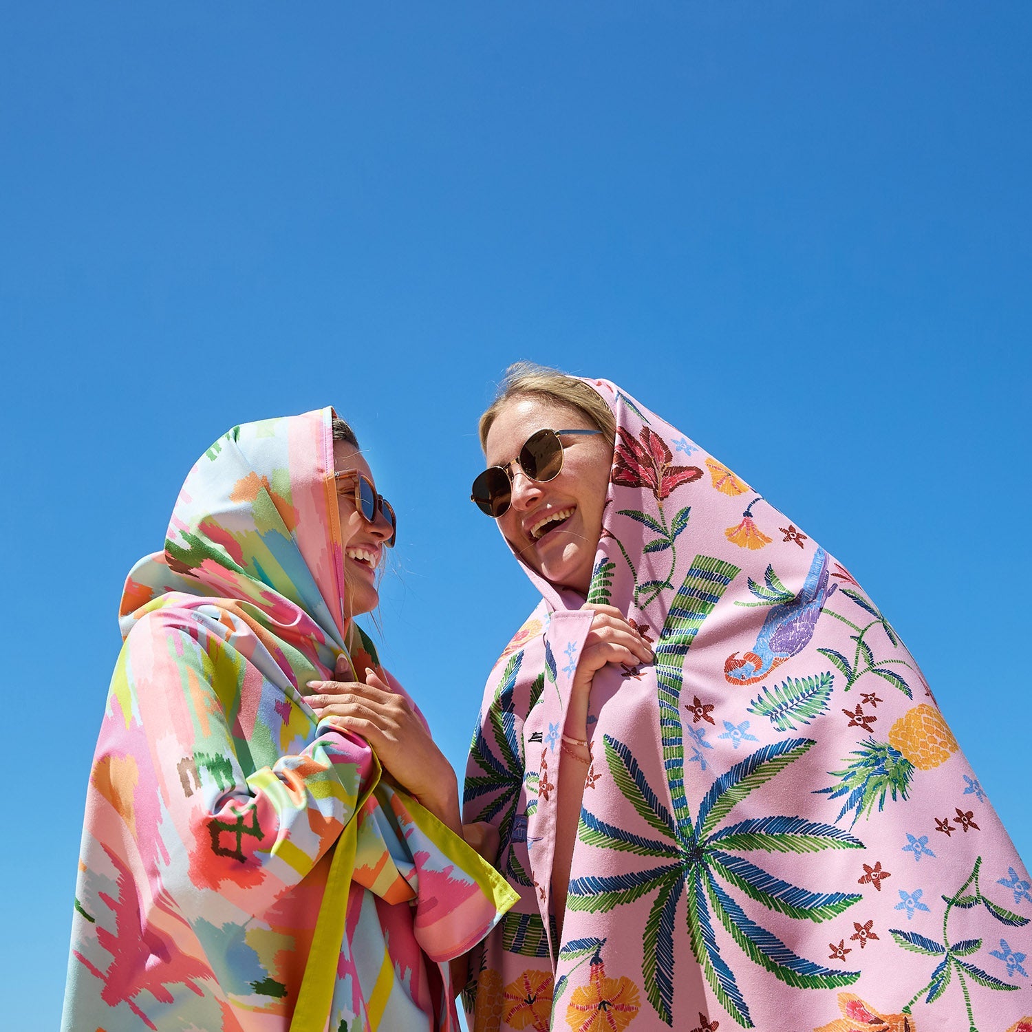 Our towels are made from 100% recycled materials using our unique DryQ™ fabric. Unlike cheaper microfiber towels, ours are super soft on your skin with no scratchy feel. The loop free design means sand won’t stick (even wet sand), and it won’t fray over time. Plus, our iconic pouch lets the towel pack down incredibly small, making it perfect for suitcases or backpacks.